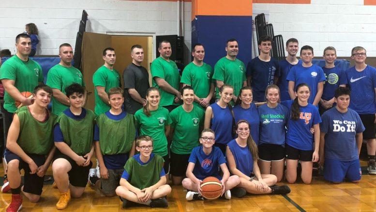 Pennsylvania State Troopers and area teenagers pose for a picture at halftime of the Troopers vs. Teens basketball game sponsored by the Harford First Congregational Church. The game was designed to have youth interact with State Troopers to promote positive decisions. The game held at Mountain View High School featured the game, activities between quarters for the younger audience, and an appearance from the Susquehanna County Dairy Promotion Court. The Troopers prevailed 57-52 in the entertaining and competitive contest. Photo courtesy of Diane Supancik.