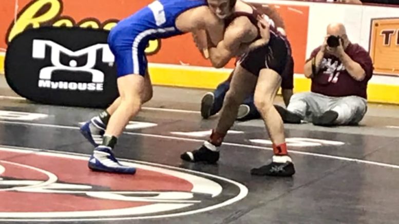 Elk Lake’s Joe Merschen pinned Mountain View’s Aaron Ransom in the second period putting Ransom on his back at the 3:05 mark and tie the match 12-12.