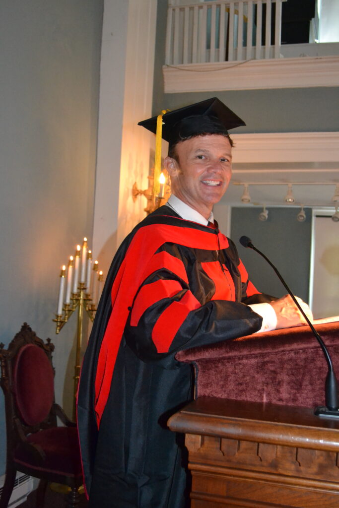 Rev. Dr. William Hagenbuch in his graduation robes pictured in the sanctuary of his Harford Church. PHOTO COURTESY WILLIAM HAGENBUCH