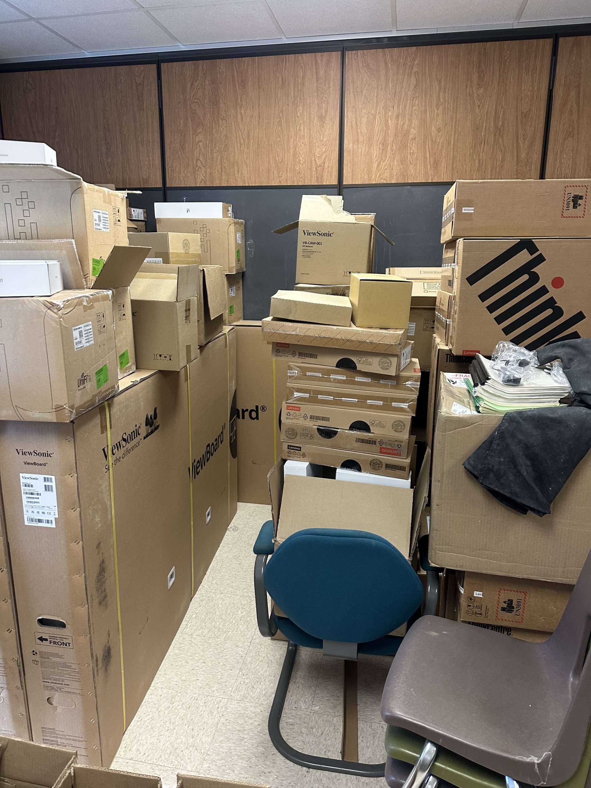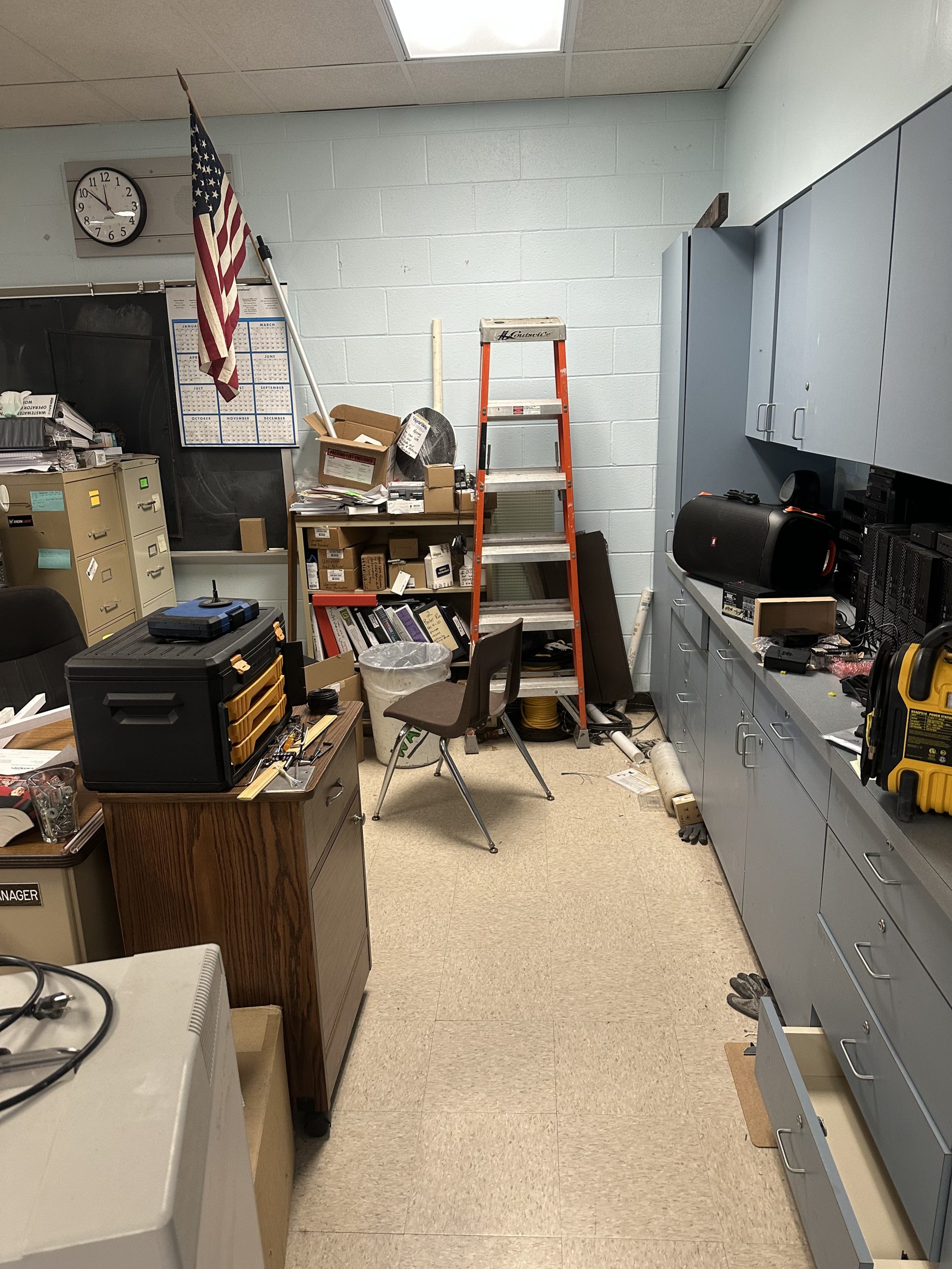 A crowded makeshift maintenance room houses tools and materials in a spare classroom at Elk Lake Junior Senior High School. Photo Provided