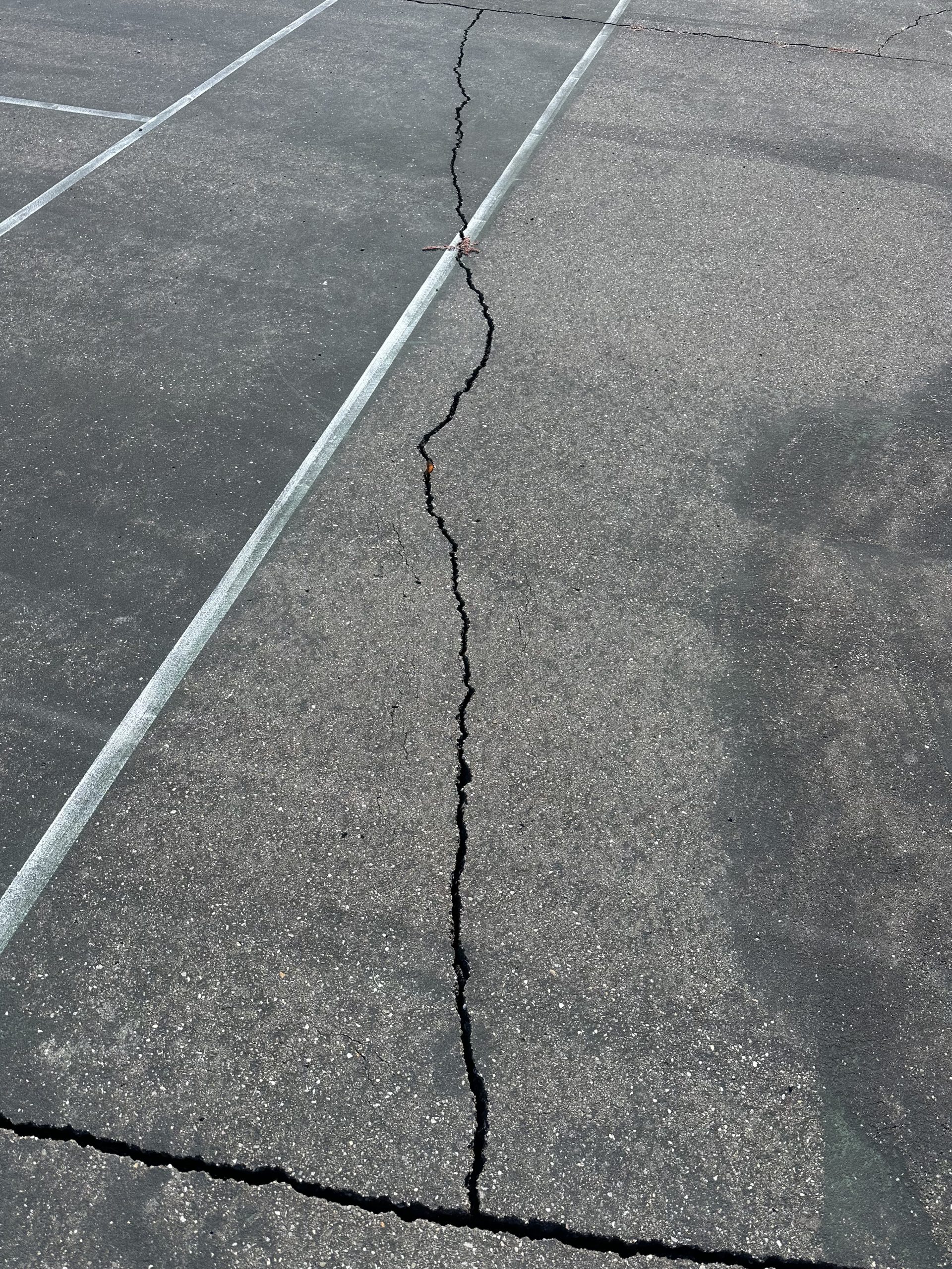 A large crack in the old tennis court at Elk Lake Junior Senior High School is just one of multiple items on a fix-it list that cannot be completed until the budget passes. Photo Provided