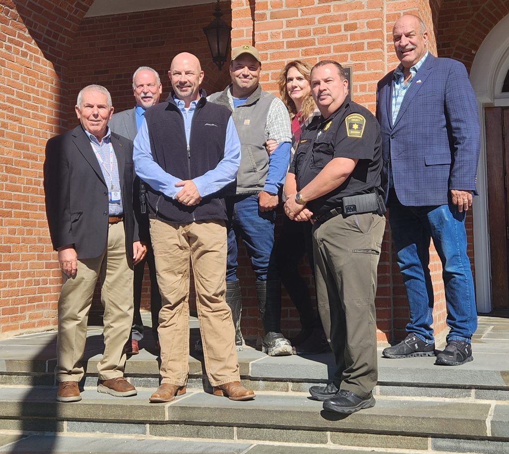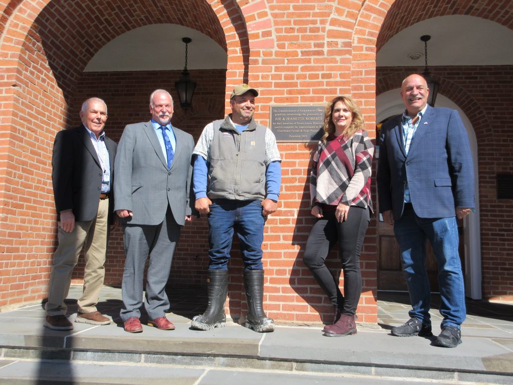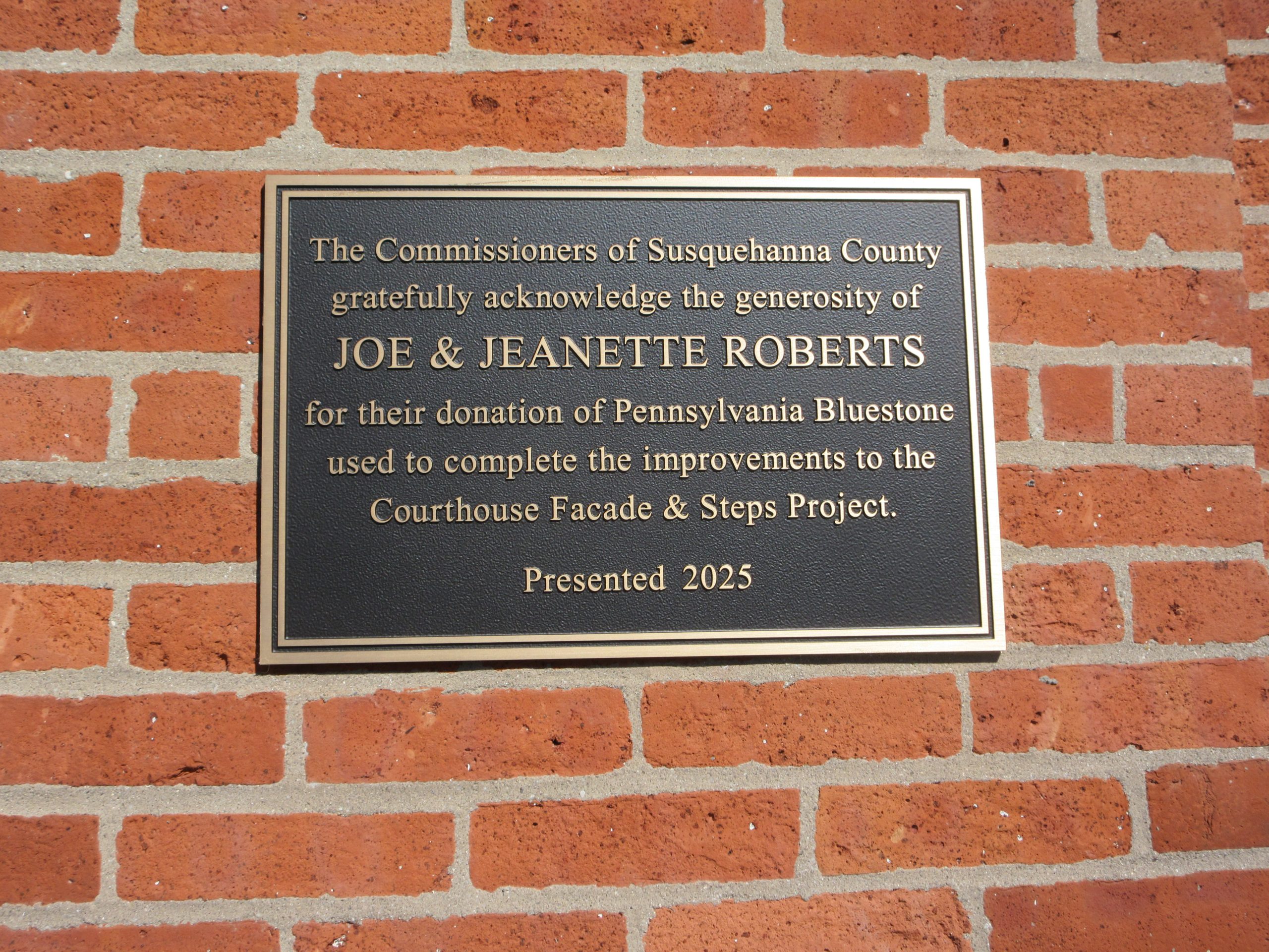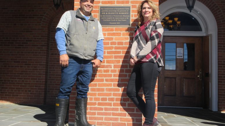 MONTROSE — A ceremony on Oct. 15 honored local couple Joe and Jeannette Roberts, co-owners of Roberts Stone LLC, for their substantial donation of Pennsylvania bluestone used to finish the renovation of the front entrance of the Susquehanna County Courthouse. Their contribution of locally quarried stone made it possible for the renovation to be completed and saved the county significant costs. A picturesque autumn afternoon provided the perfect backdrop as county officials and community members gathered on the courthouse steps to unveil a plaque on the building’s front entrance recognizing the Roberts family for their donation.