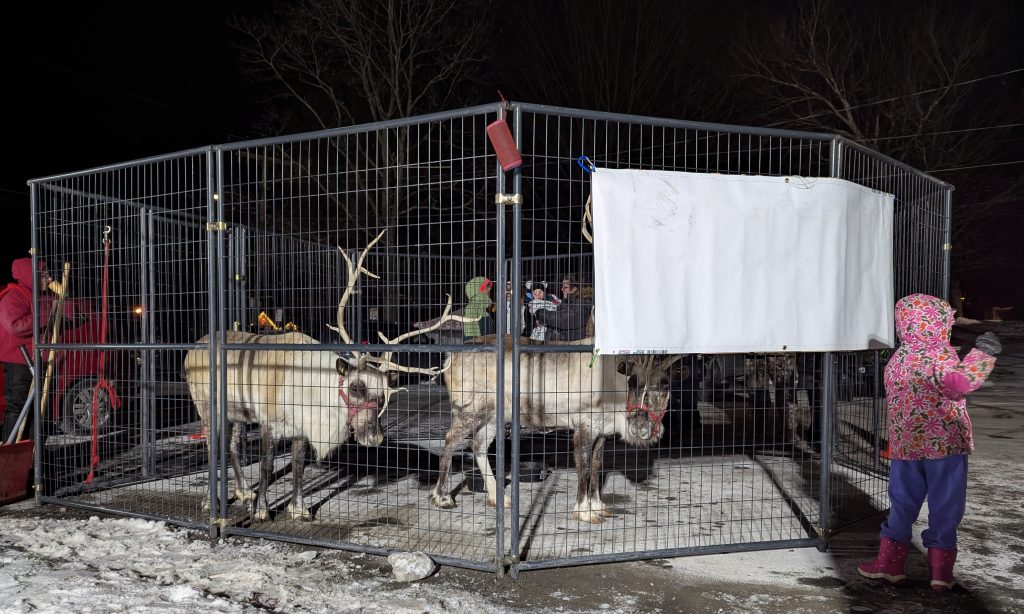 “This is my second time doing this up here,” said Damien Dawber, part of the farm’s staff. The pair, Snow and Cece, are mother and daughter. The piebald does get antlers too, but it’s the male piebalds that lose their antlers first, Dawber said. “I love seeing the people’s reactions,” he said. “Believe it or not, the adults sometimes are more excited than the kids, and people don’t always believe that reindeer are real until they actually see them.”
