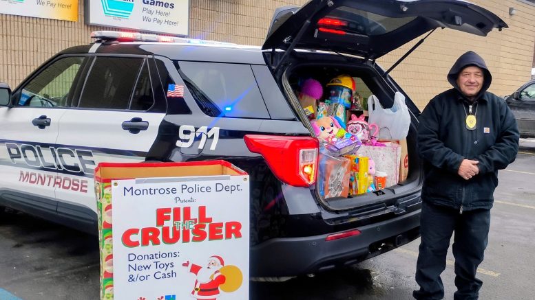 MONTROSE — Sgt. Andrew Genneken stands on duty at Scarfalloto’s Market in Montrose during the “Fill The Cruiser” event collecting toys and items for children on Dec. 13. The event was presented by Kiwanis and Montrose Borough Police. Genneken and his daughter Mary Jane are annual dignitaries for the event as well. Photo by Carole Canfield