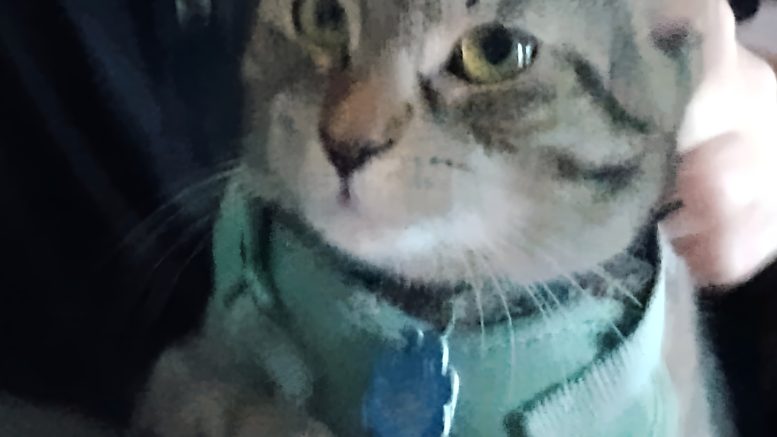 But none of these sights compare to the moment I did a double take at what looked, at first glance, like an ordinary backpack on my neighbor Ziva’s Coons shoulder. It wasn’t a backpack at all. It was NovaLee, Ziva’s two-year-old tiger-striped kitty perched calmly on her shoulder like she owned the town.