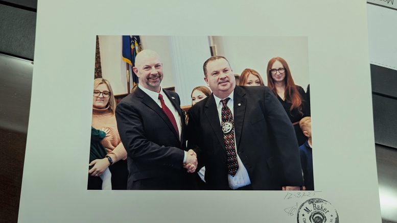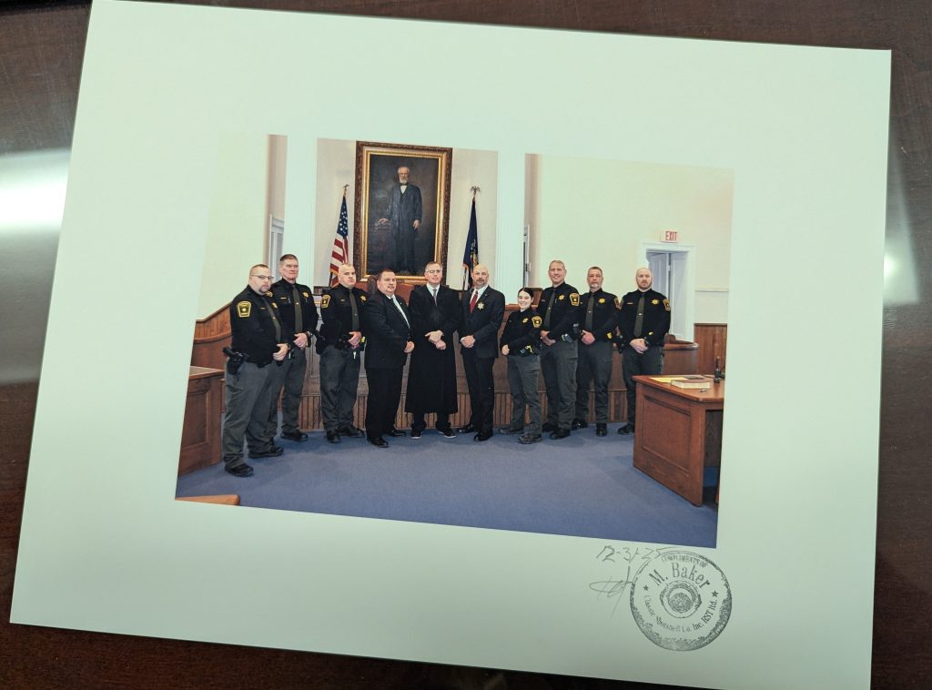 The swearing in ceremony on New Year’s Eve for John Oliver, new sheriff of Susquehanna County in a photograph by Morris Baker. Lauren Royce Photo