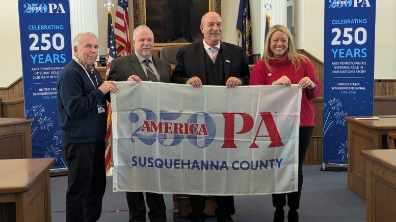 Left to right: Susquehanna County Commissioners Bob McNamara, Dave Darrow and Alan Hall with Cassandra Coleman at the 250PA kickoff event hold a 250PA flag. Lauren Royce Photo